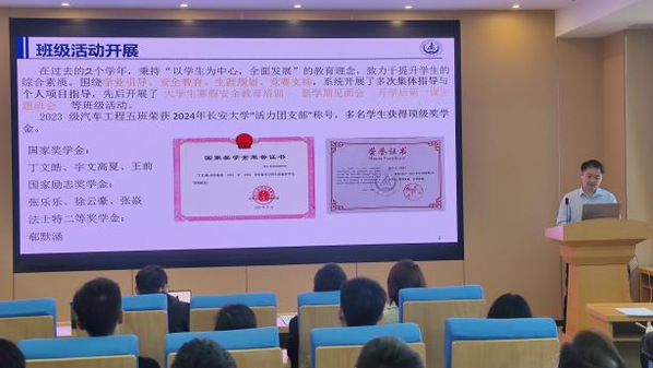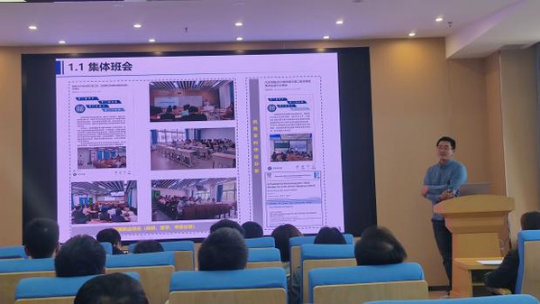 在经验交流与培训环节,2024-2025学年本科生班主任考核优秀的孙汝奇、彭俊结合自身带班经历,分享了自己对于班主任工作的理解和感悟,并就班级建设进行了经验分享。