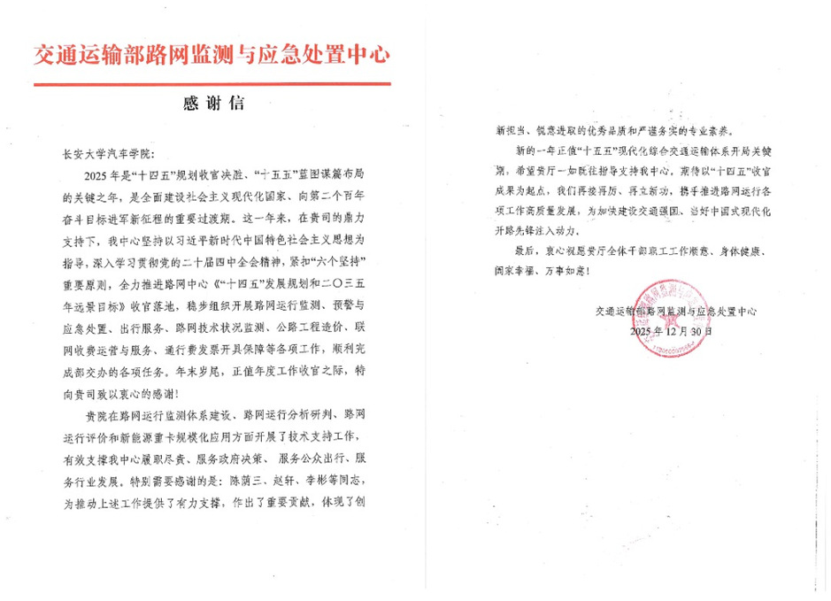 免费成人影片深耕交通运输领域学科建设与行业服务,与路网中心建立了长期稳定的合作关系。此份感谢信既是荣誉更是激励。免费成人影片 将以此次表彰为契机,再接再厉,持续深化与交通运输部路网监测与应急处置中心及行业各单位的产学研合作,聚焦智慧交通与应急处置领域关键技术瓶颈,强化科研创新与人才培养,不断提升社会服务能力与行业贡献度,为加快建设交通强国贡献更大力量!